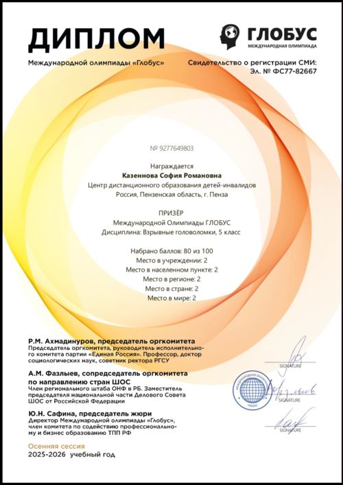 Ученики 5 класса Казеннова София и Яворский Артемий приняли участие в международной Олимпиаде «Глобус».