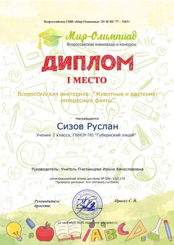 Ученик 2 класса Руслан Сизов принял участие во Всероссийской викторине «Животные и растения: интересные факты» и занял 1 место!